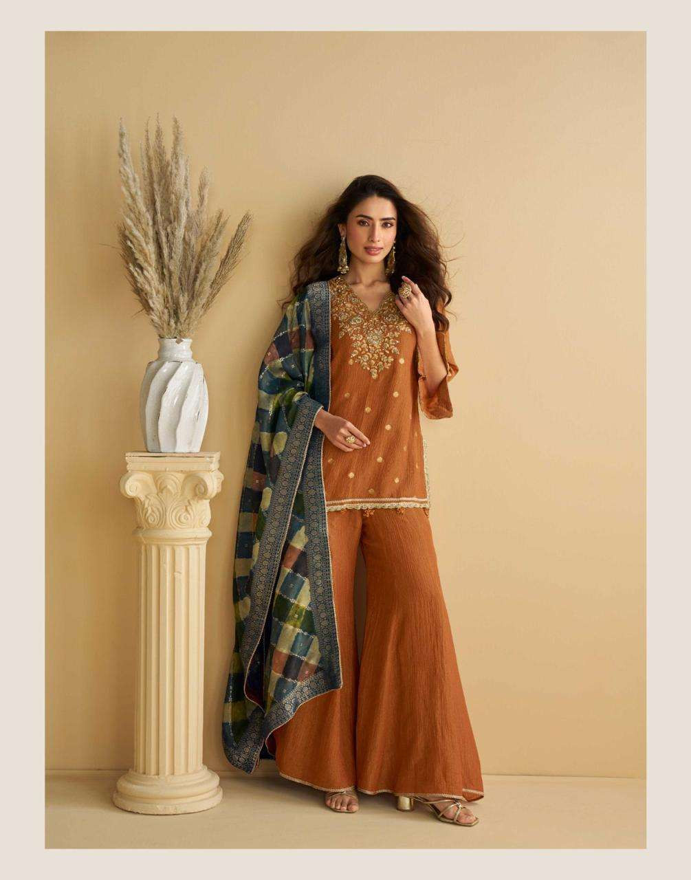 The Plazzo / Sharara, made from matching premium Chinon silk, adds comfort and movement while maintaining a coordinated and balanced look. Completing the ensemble is a matching Chinon silk Dupatta, enhancing the outfit with a polished and cohesive finish.