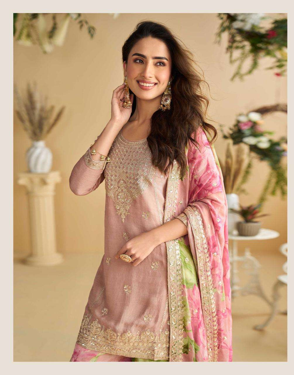 This elegant partywear embroidered suit set is crafted from real premium Chinon silk, offering a soft drape and a refined, contemporary finish. The Top features latest trendy embroidery, designed to create a graceful and stylish silhouette that pairs beautifully with the flowing bottom.