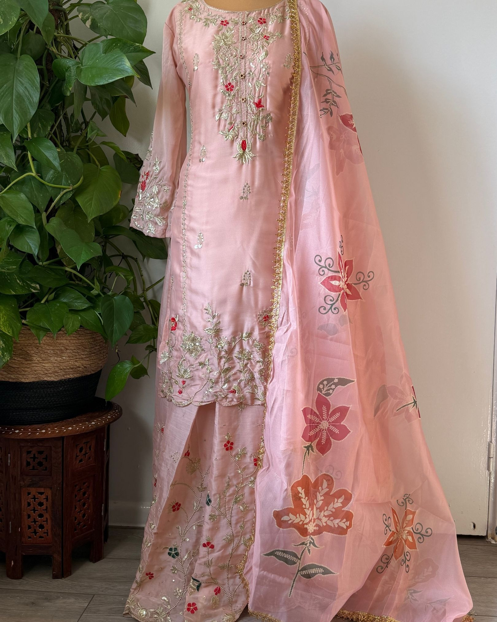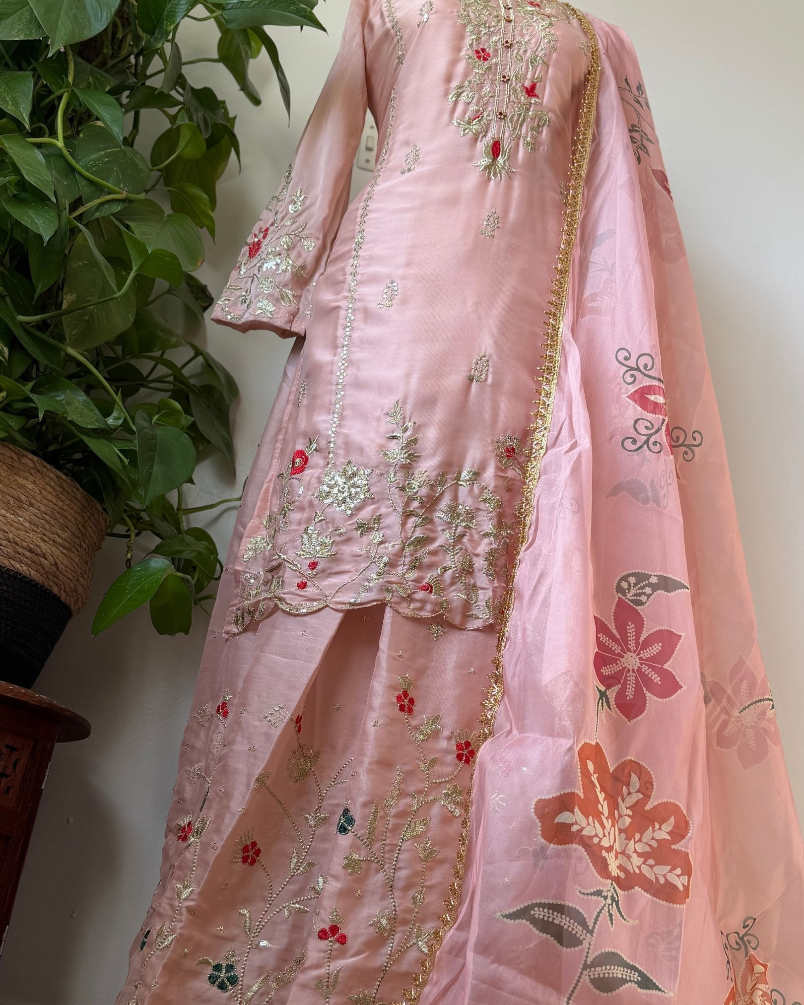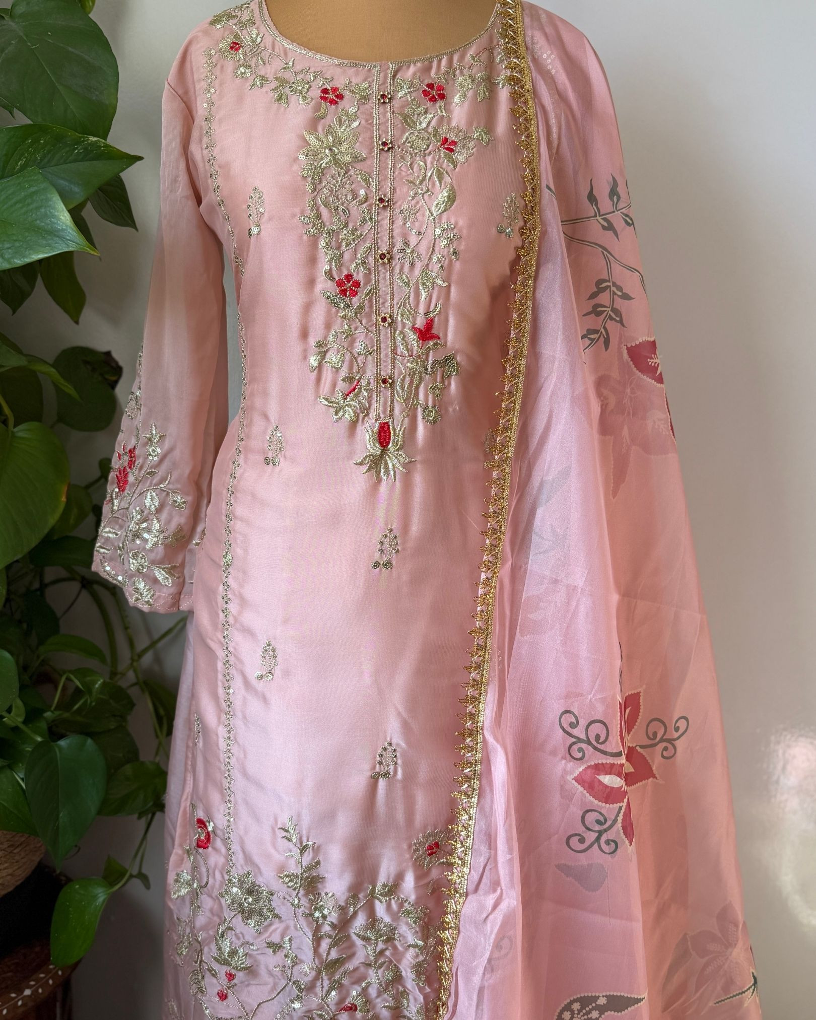 Completing the set is a lightweight Organza Dupatta, designed to add softness and dimension. Its airy drape contrasts beautifully with the structured silk, enhancing the overall elegance of the ensemble.