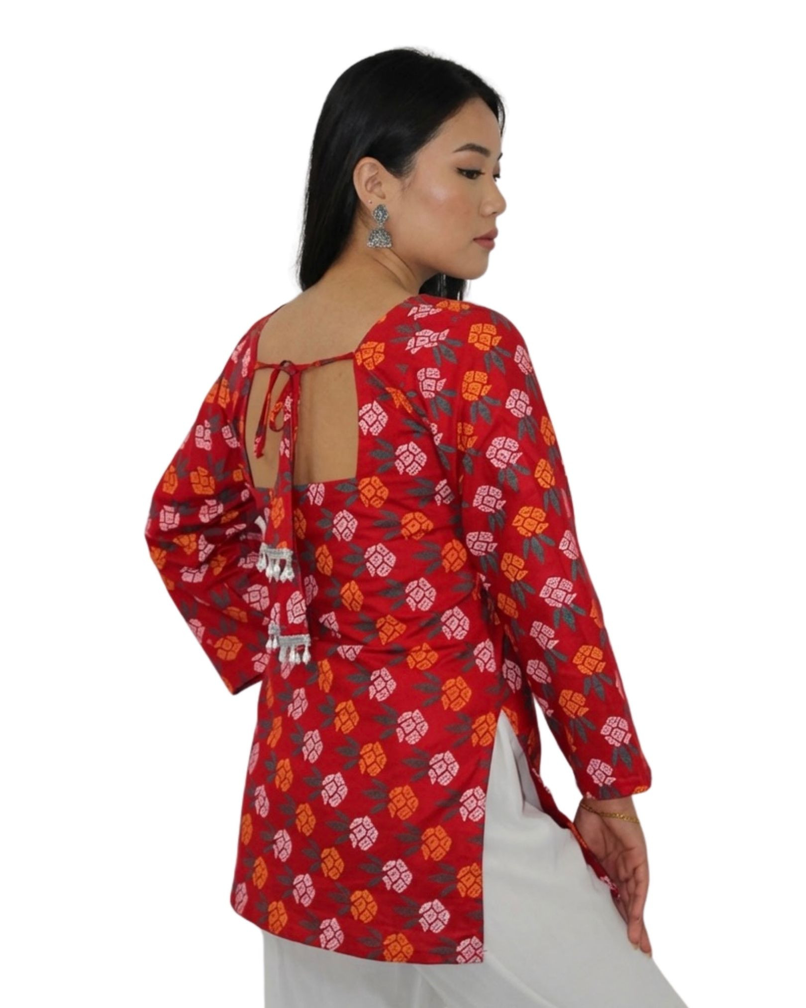 The design showcases a clean, straight silhouette with full sleeves and subtle side slits for ease of movement. At the back, an adjustable tie-up detail with tassels creates a distinctive open-back accent, allowing for a comfortable, customisable fit while adding a graceful touch. The square neckline at the front keeps the look modern and versatile, making it easy to style for both casual and semi-festive occasions.