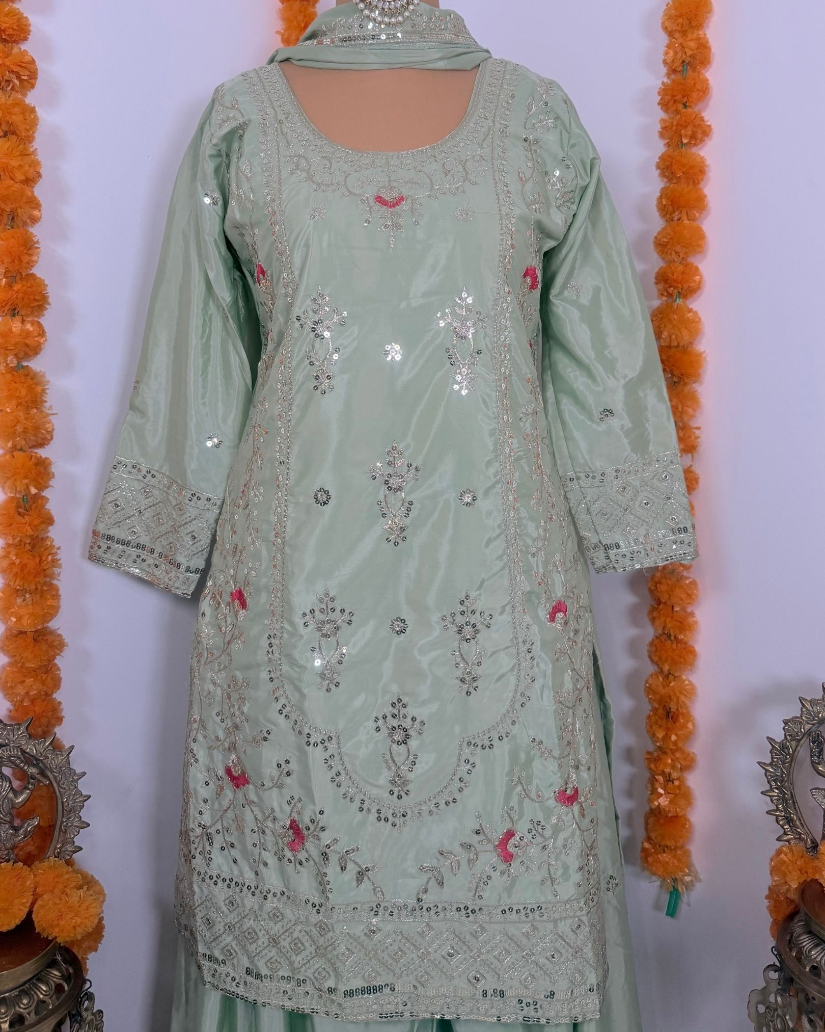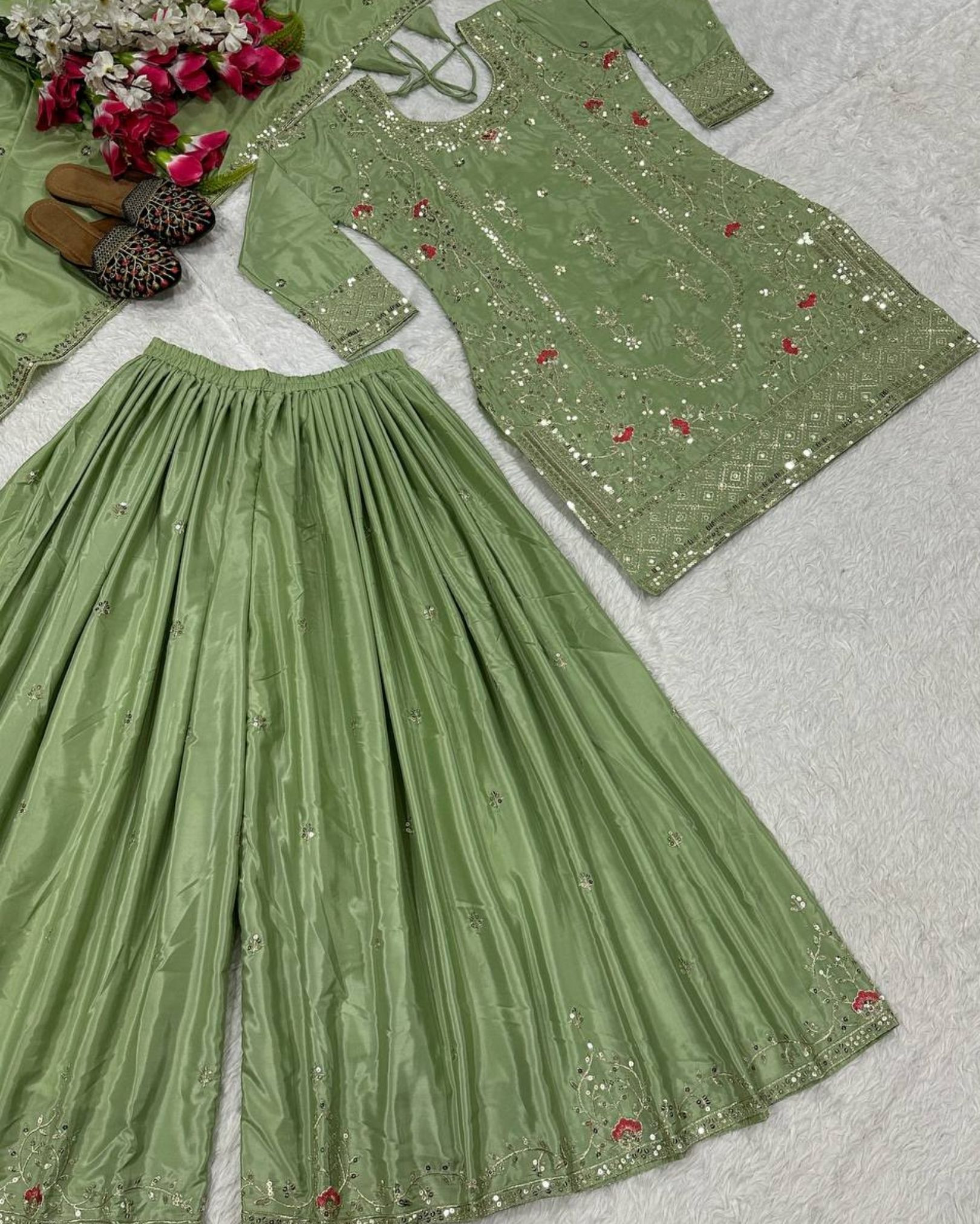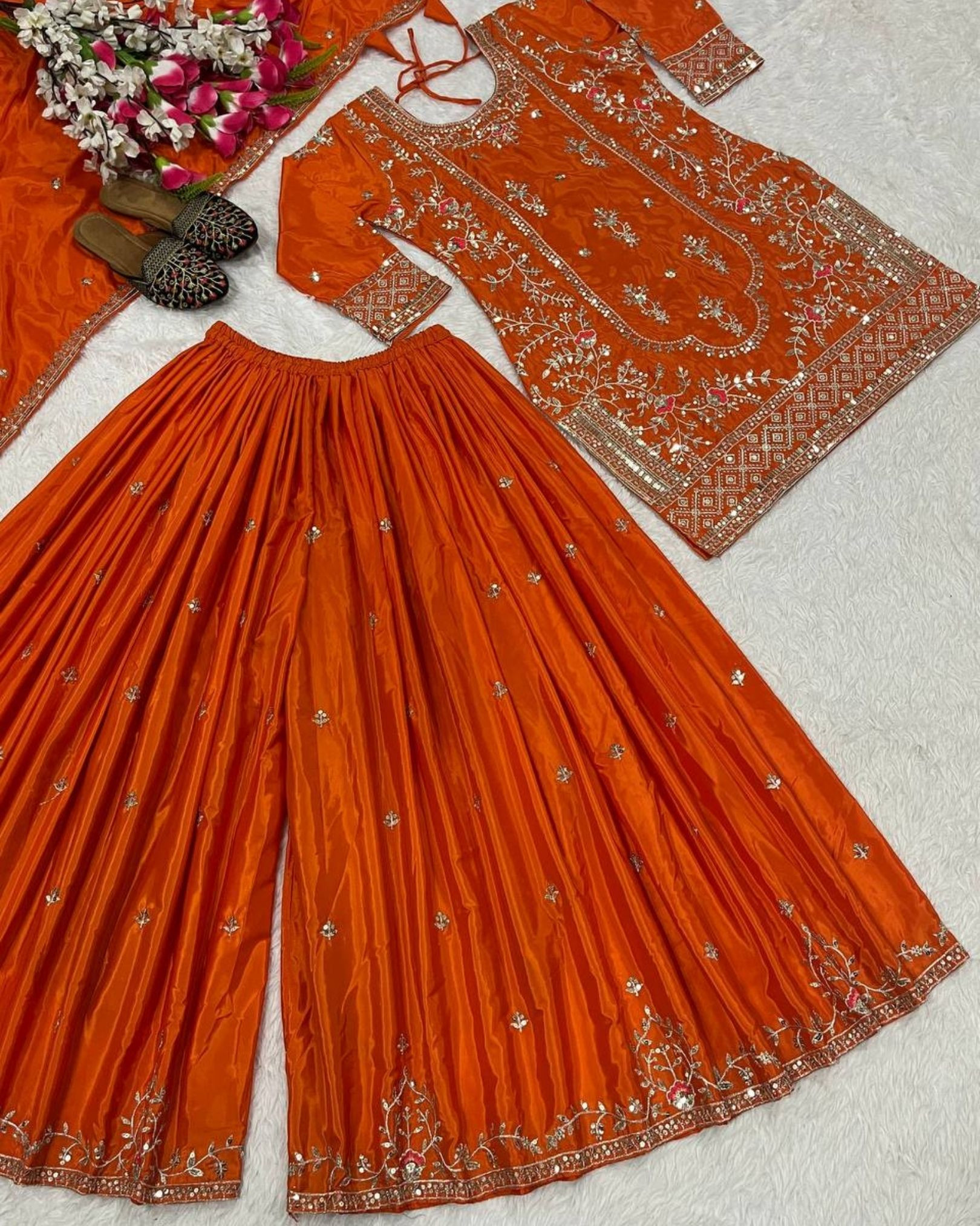 This new designer party-wear Top, Sharara Palazzo, and Dupatta set is crafted to deliver an elegant and statement look for special occasions. The Top is made from natural crepe material and enhanced with 9mm sequins embroidery work, adding rich detail and festive appeal. Designed with full sleeves and a comfortable micro cotton lining, it offers a flattering fit with a length of 35–36 inches. The Top is fully stitched and ready to wear, available in sizes S (36), M (38), and L (40).