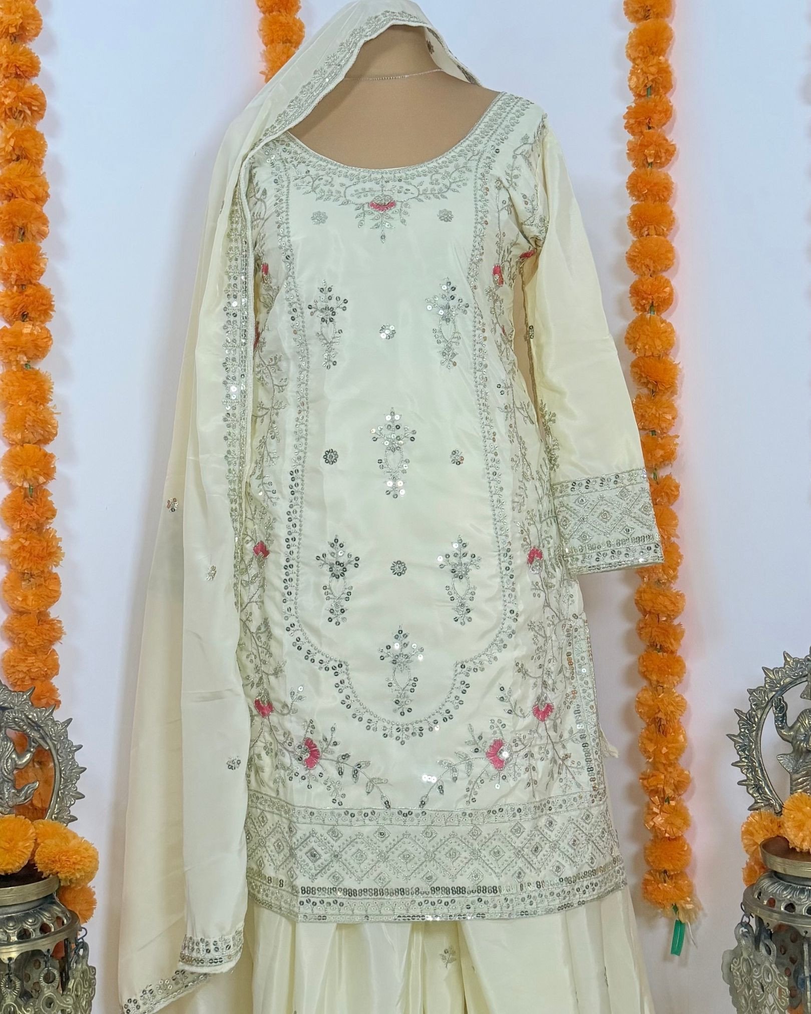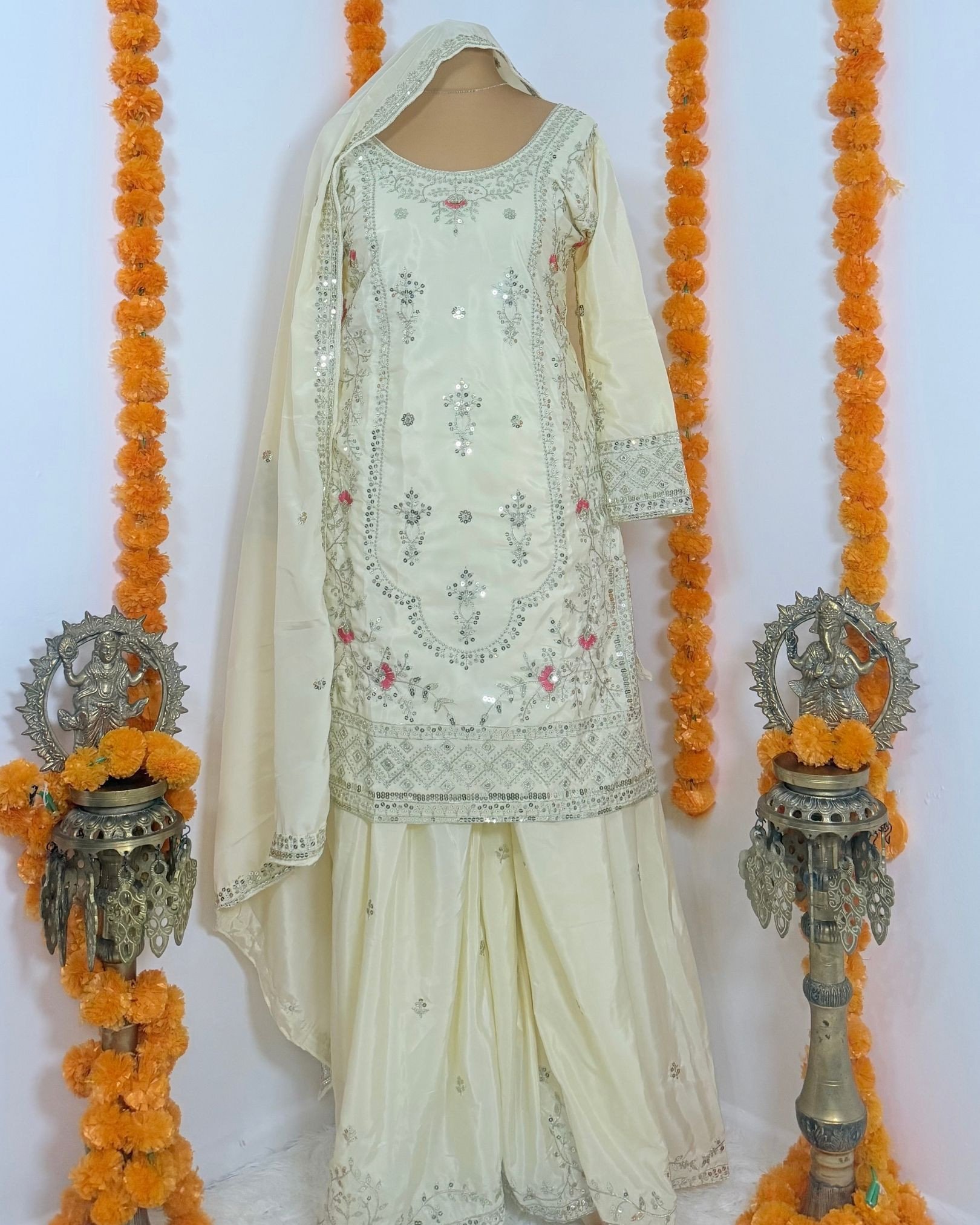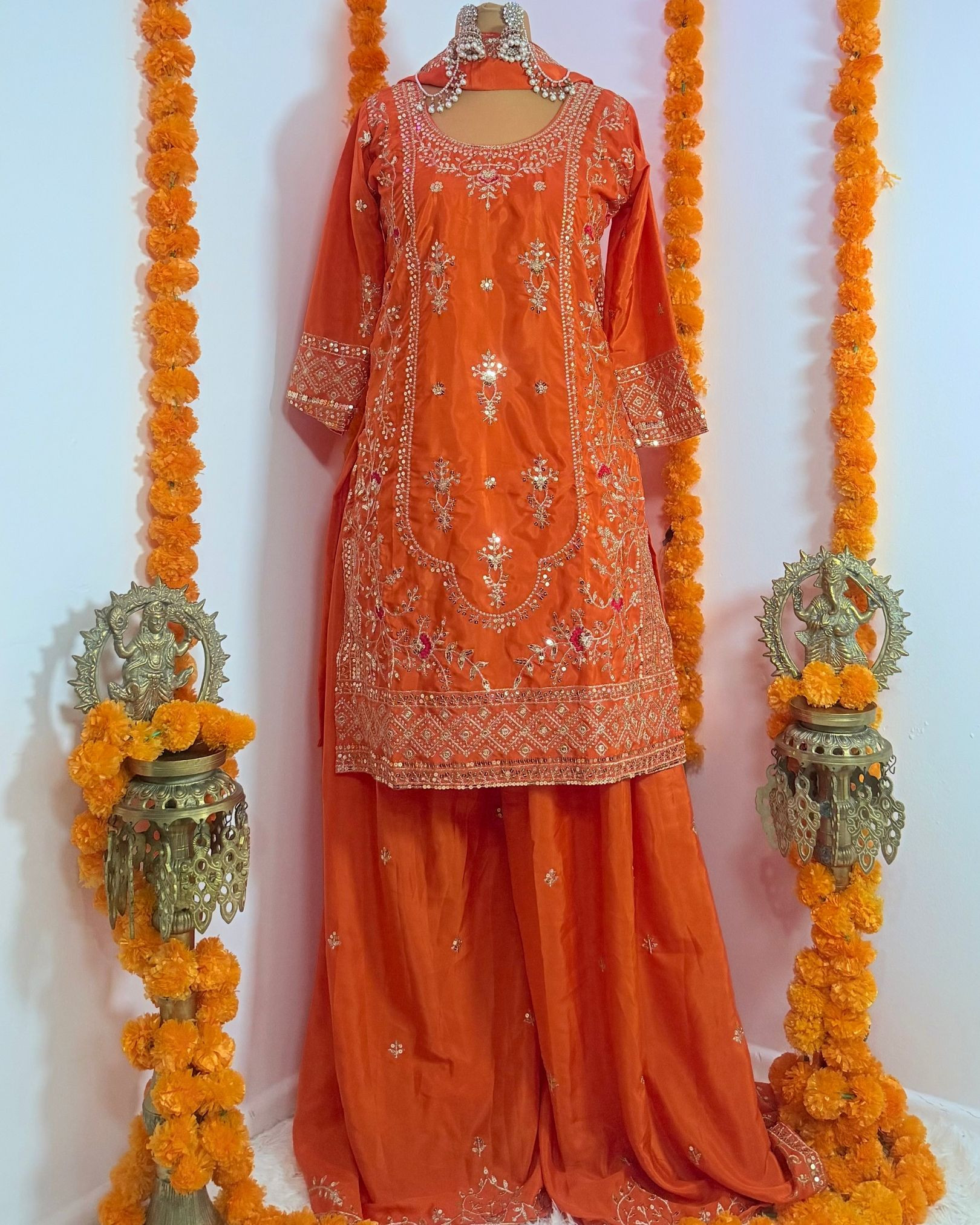 This new designer party-wear Top, Sharara Palazzo, and Dupatta set is crafted to deliver an elegant and statement look for special occasions. The Top is made from natural crepe material and enhanced with 9mm sequins embroidery work, adding rich detail and festive appeal. Designed with full sleeves and a comfortable micro cotton lining, it offers a flattering fit with a length of 35–36 inches. The Top is fully stitched and ready to wear, available in sizes S (36), M (38), and L (40).