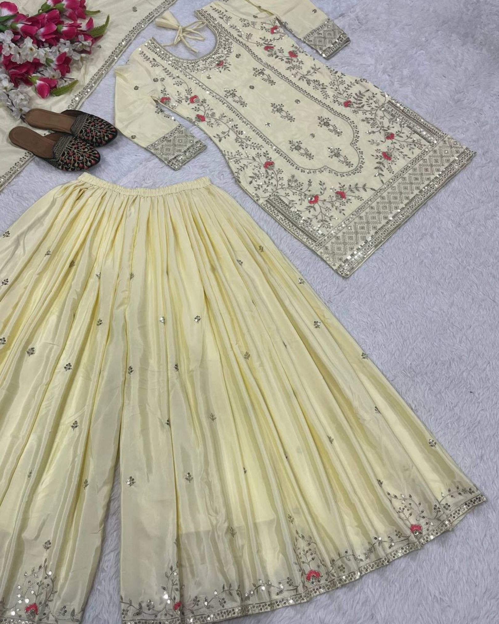The Sharara Palazzo is created from matching natural crepe fabric, featuring 5mm sequins embroidery work for a coordinated finish. Fully stitched in a classic sharara-palazzo style, it provides graceful movement and comfort with a length of 40–41 inches and a soft micro cotton inner lining.