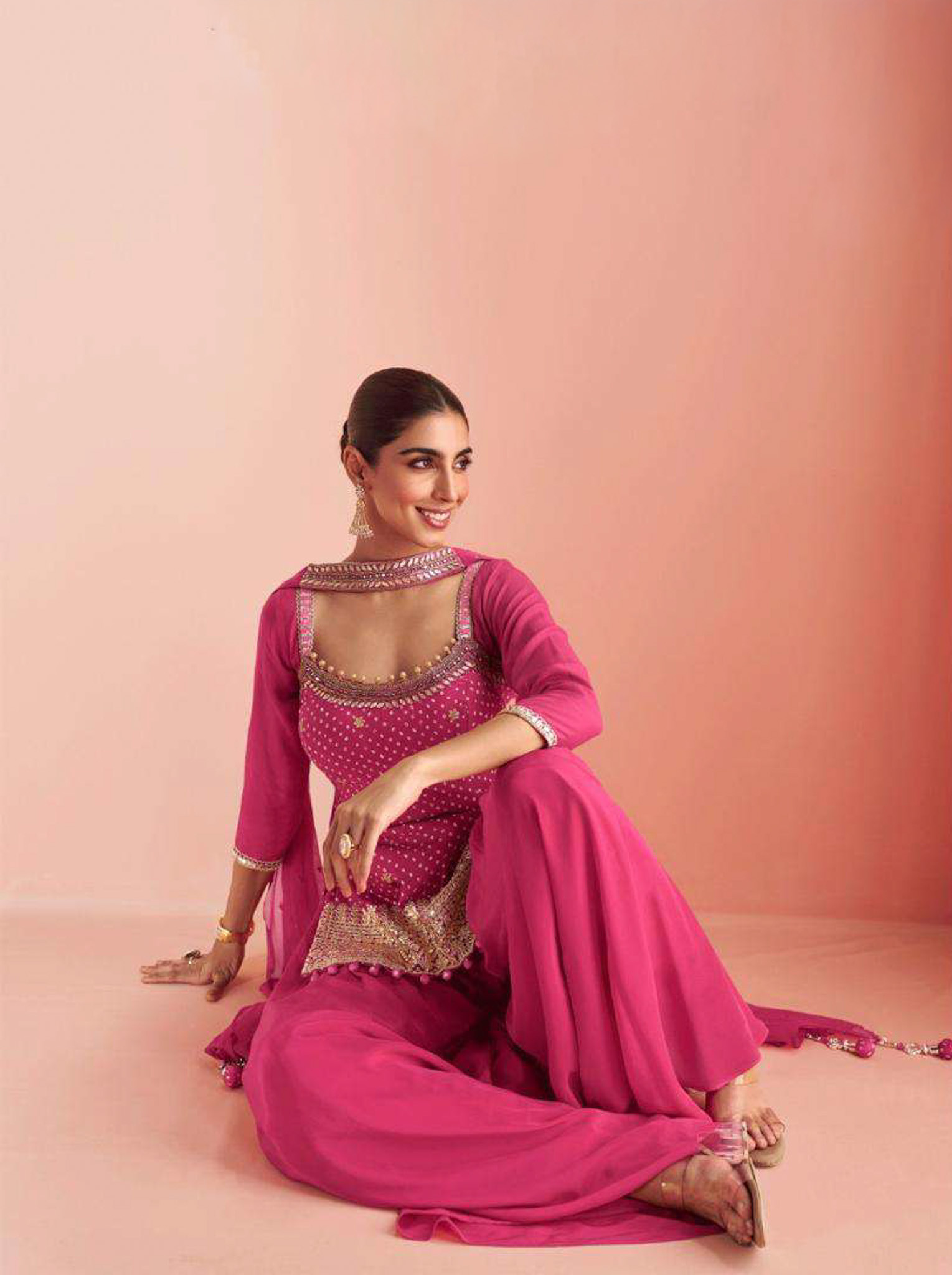 This stunning partywear embroidered suit set is crafted from premium Chinon silk and real premium silk, designed to deliver elegance with a modern festive appeal. The short Top features heavy embroidery with mirror work, creating a rich, eye-catching finish that elevates the overall look. Thoughtfully tailored, the silhouette pairs beautifully with the flowing bottom for a balanced and stylish ensemble.