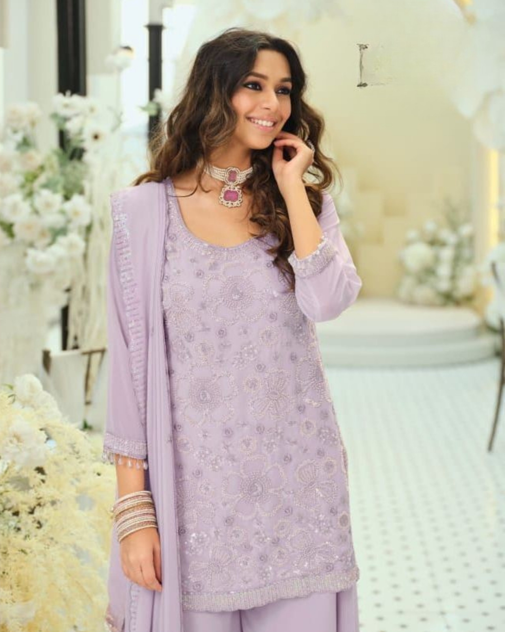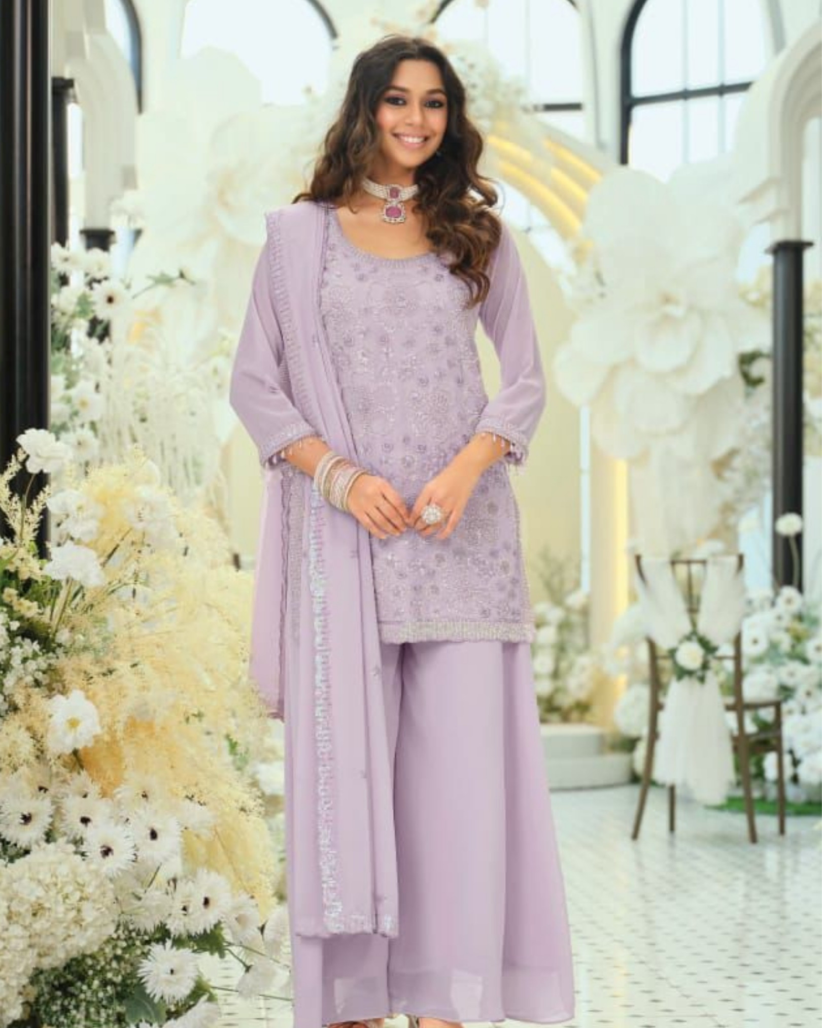 This elegant Rosy Real Georgette Palazzo Set is designed to offer lightweight grace and effortless festive charm. Crafted from soft, flowing real georgette, this ensemble combines delicate detailing with comfortable structure, making it ideal for both celebrations and special gatherings.