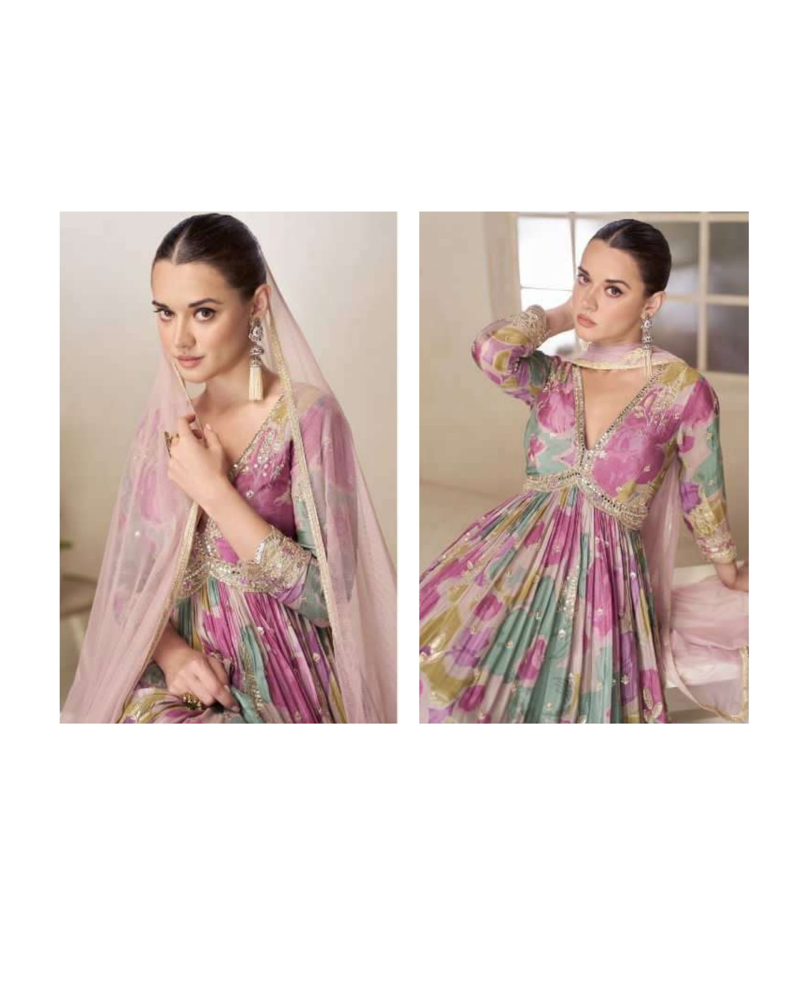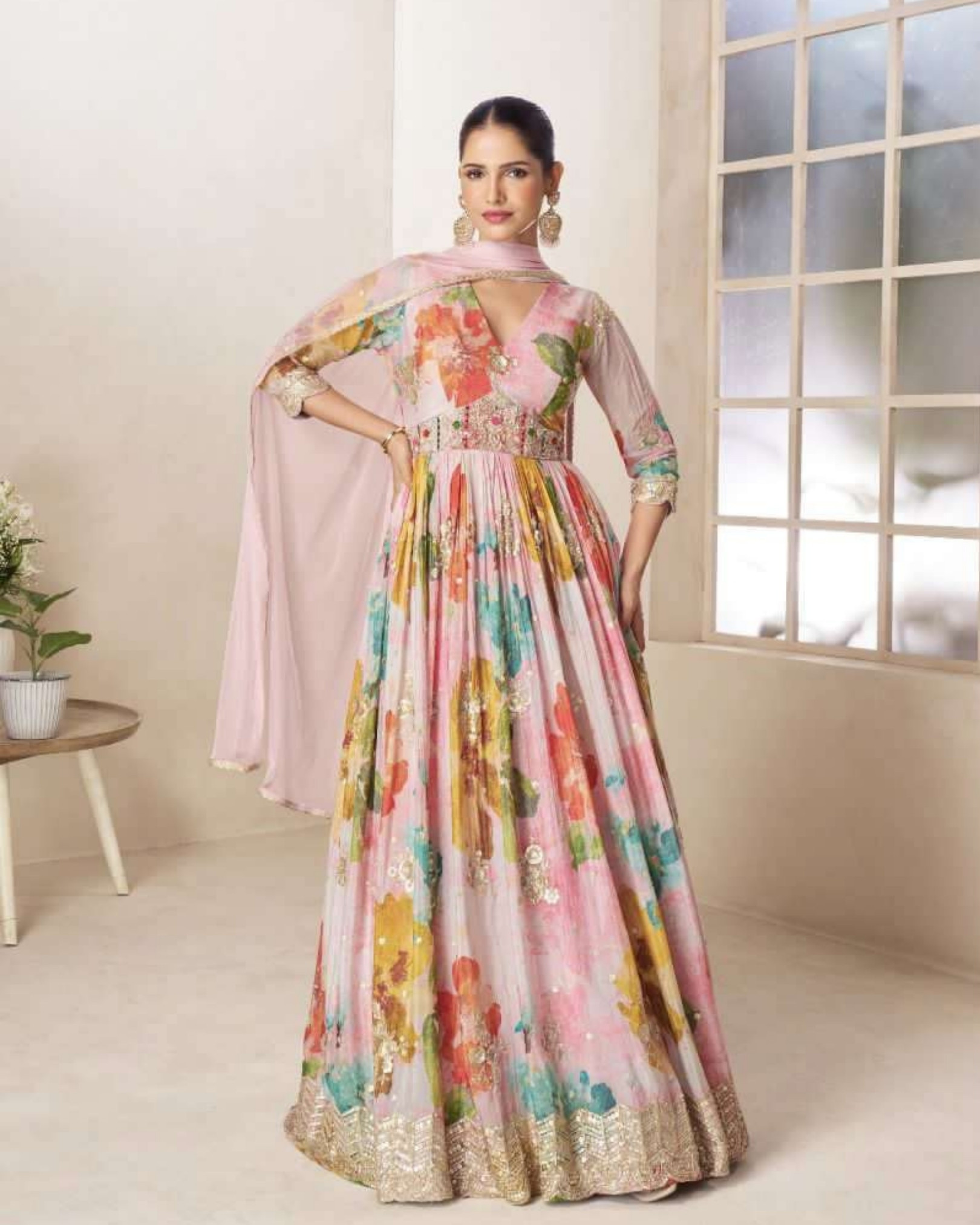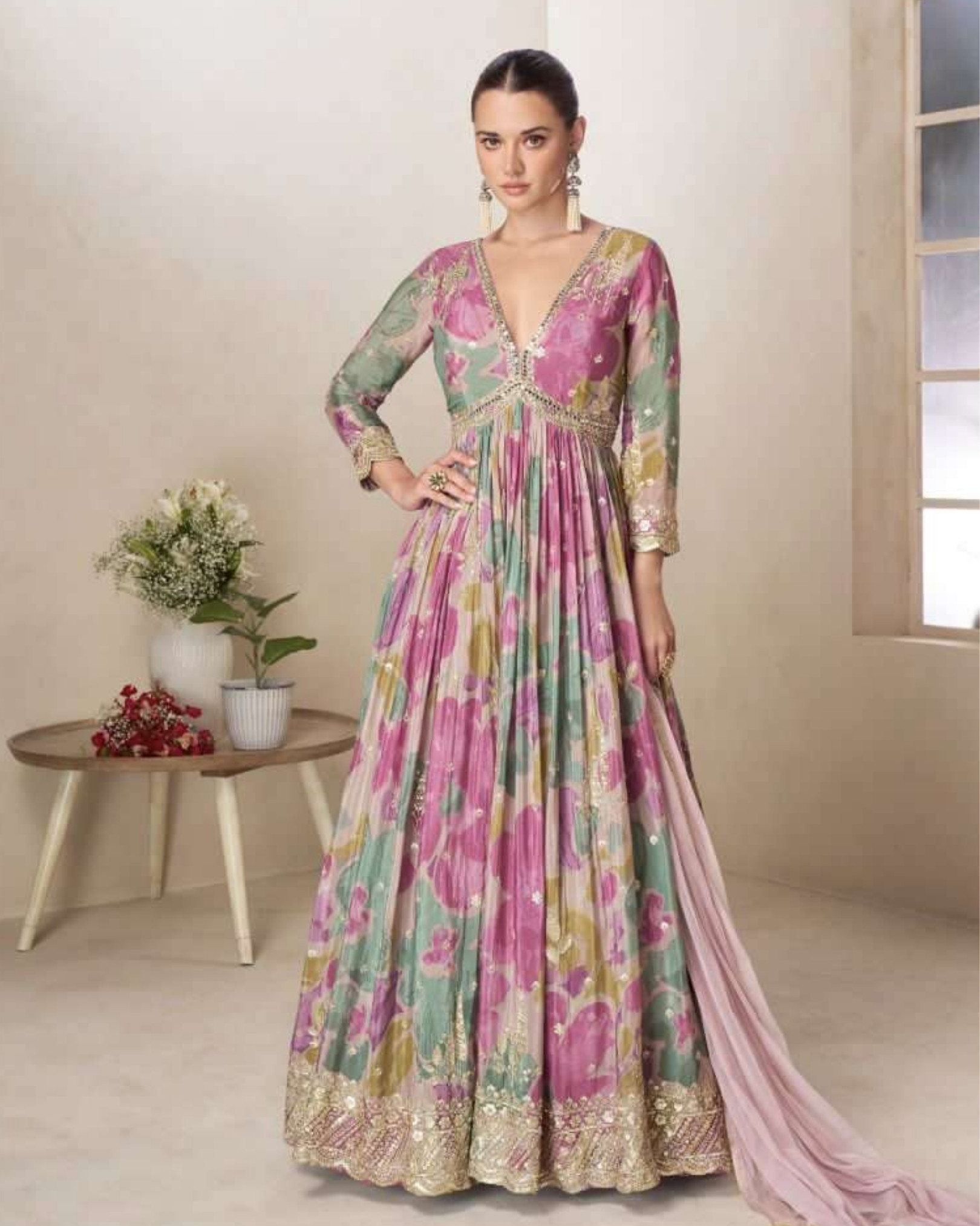 This elegant Rushika – Gulkayra Real Chinon Digital Print Designer Gown Collection is crafted to bring graceful movement and contemporary festive charm to your wardrobe. Designed with rich fabric and statement styling, this gown set blends lightweight comfort with a luxurious occasion-ready finish.
