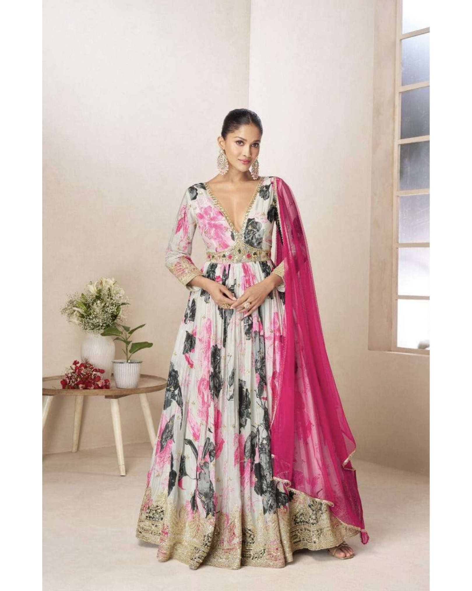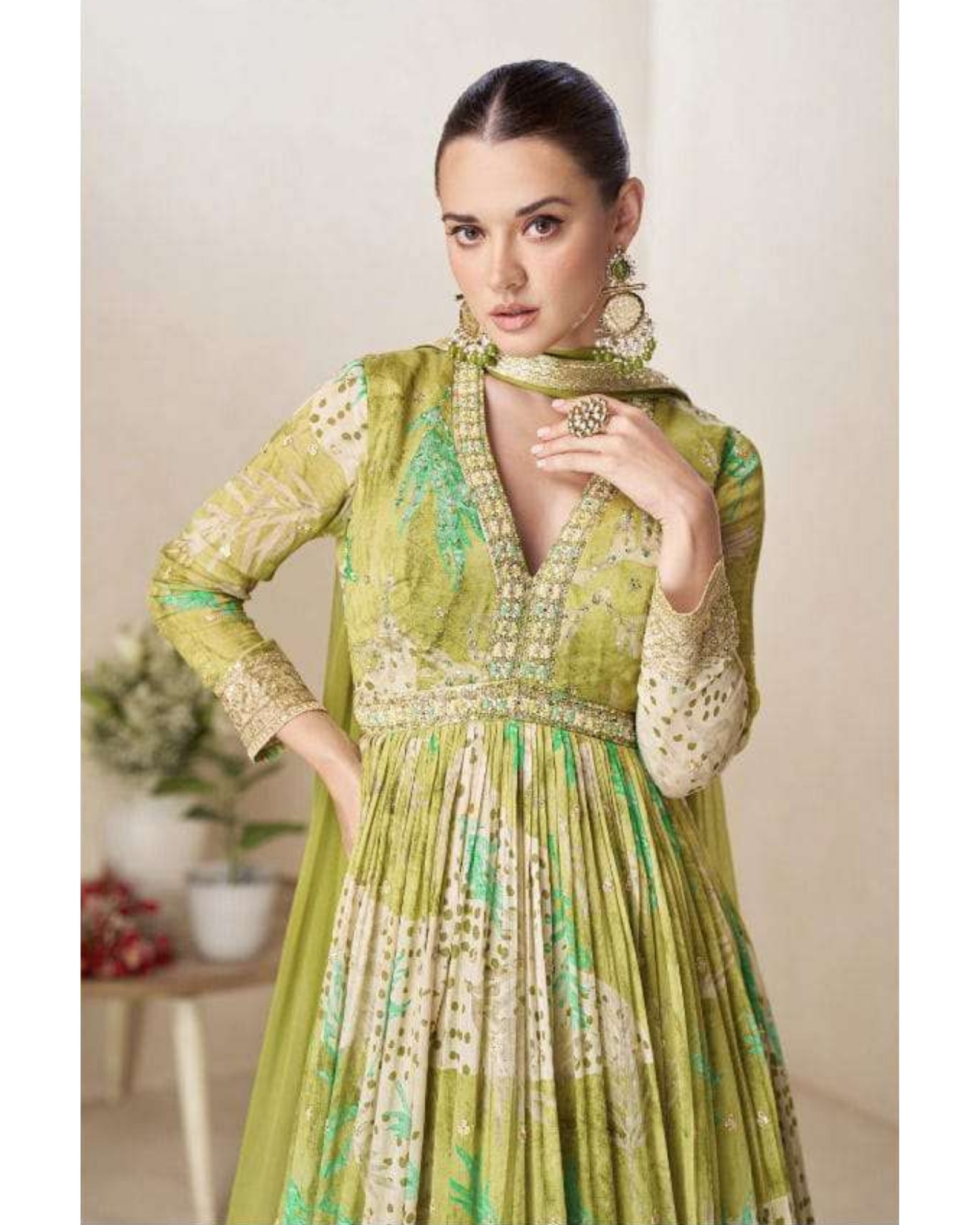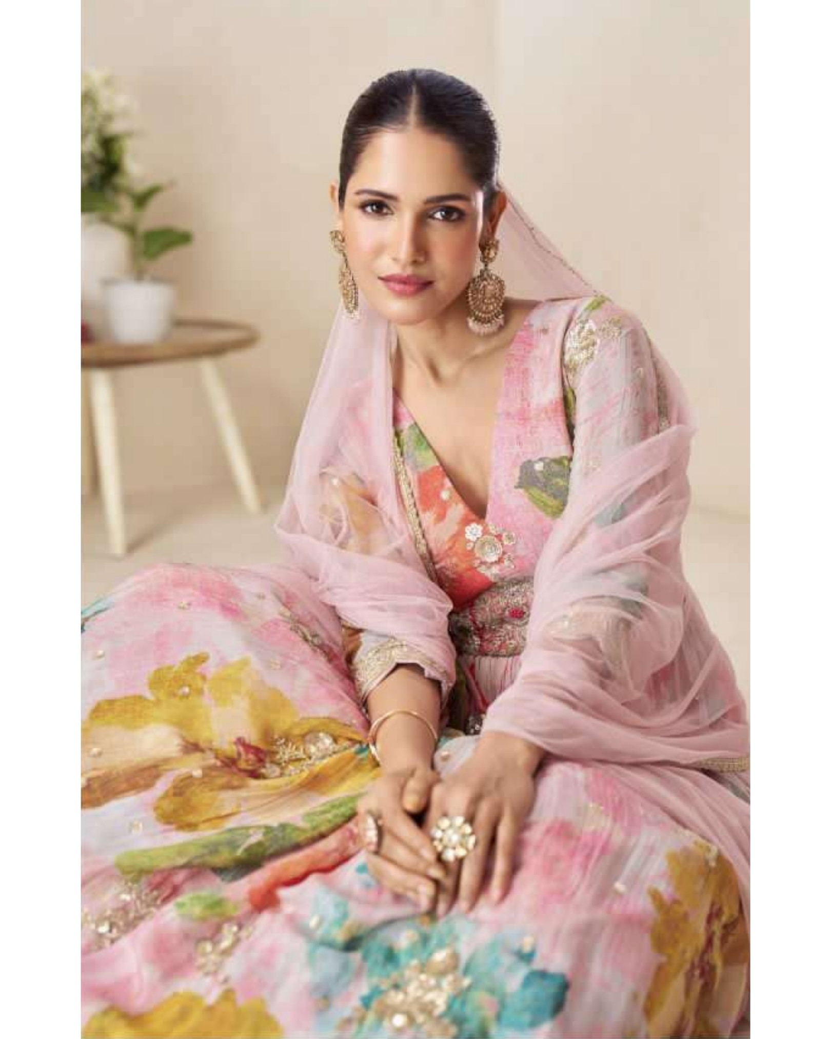 The Gown (Top) is made from premium real Chinon fabric, enhanced with vibrant digital print detailing that adds depth, colour richness, and a modern designer appeal. The soft flow and natural drape of Chinon create a flattering silhouette, making it ideal for festive and party occasions.